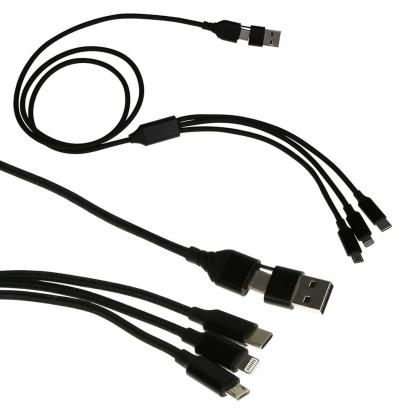 Universal 5in1 charging and data cable. With the possibility of combining USB Type C or USB A (standard) as the output plug on USB Type C, Micro USB and Lightning. One single cable for all modern smartphones, MacBooks, USB Type C power supplies or many other devices. In addition to the charging function, 5in1 MultiCable enables simple and secure data transfer (for example between laptop and smartphone). The double-insulated, one-metre cable is durable and robust. A sheathing with nylon fabric and anti-kink reinforcements on the aluminium connectors reliably protect against cable breakage or wear. Customised with your logo as print or engraving.