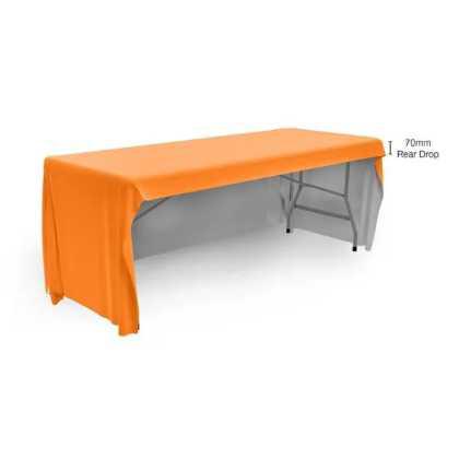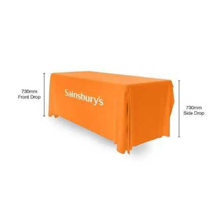 Branded tablecloths are a fantastic marketing technique for drawing people to events like open days, and other social gatherings.With full colour print available you can customise your design however you like. Use this to promote your business by providing a beautifully printed tablecloth that is eye-catching and leaves an impact on everyone on any occasion.  With the potential for careful reuse, this product stands out as a superb and budget-friendly marketing instrument. Crafted from polyester it boasts resilience and, when handled appropriately (following the provided wash care instructions), it resists to wrinkles and shrinking.Featuring an open back design, this product offers a discreet solution for concealing boxes or personal items beneath the table, effectively keeping them hidden from view. Additionally, this design choice enhances the stability of the fabric, as there is a reduced likelihood of accidental stepping or pulling, thanks to the unobtrusive positioning of the shorter side.This product is suitable for both indoor and outdoor use.