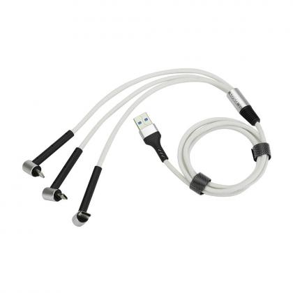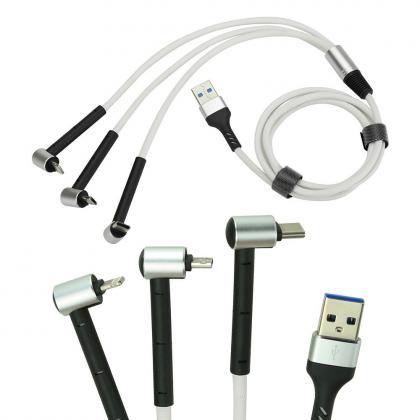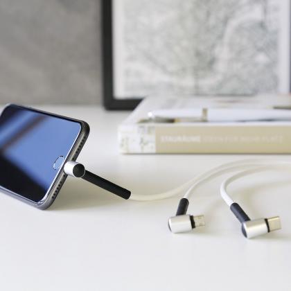 3-in-1 charging cable with Lightning, Type C and Micro USB. Recharges both iOS and Android devices as well as latest generation iPads. Clever design makes the cable doubles as a smartphone cradle. Reinforced with a modern textile cover for longer durability. Customized with your logo as engraving or printing on the aluminum elements. Available in white or black, from 3,000 pieces in special color.