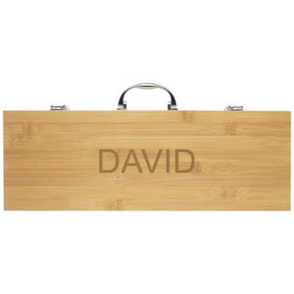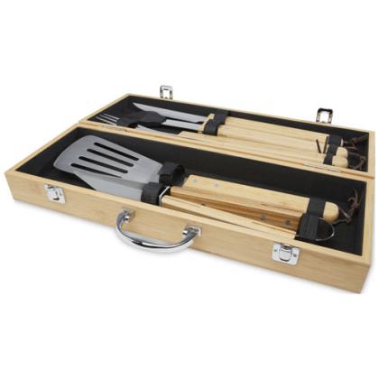 Bamboo 5-piece BBQ set with a shovel (40 x 9.5 cm), tong (34.5 x 6 cm), fork (38.5 x 3 cm), knife (38.5 x 3 cm), and brush (38 x 4.3 cm). The set is delivered in a bamboo gift box (46 x 16.2 x 7.4 cm). The handles and gift box are made of bamboo that is sourced and produced following sustainable standards.