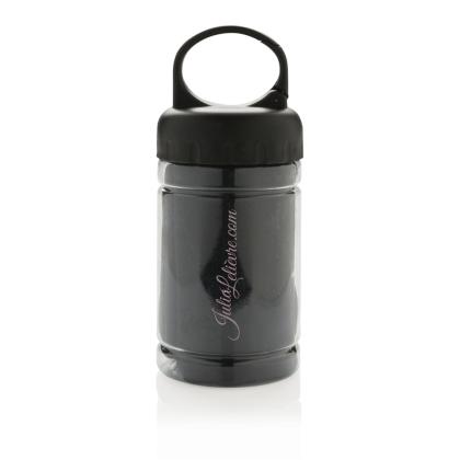 Microfibre cooling towel 100% free of chemicals. 98% sun blocking function up to UV 50+ protection. The towel can be easily used by adding some cold water to the bottle creating a cool towel for fast refreshment. The bottle is made out of PP with ABS top and carabiner to take along on outdoor activities. 77 x 30cm.