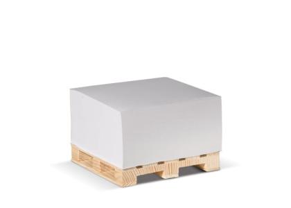 Cube pad with white paper on wooden pallet. Ideal for use at home or at the office. Circa 420 sheets of 90g/m². Each cube comes shrink wrapped.