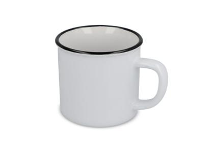 This enamel-style ceramic mug combines vintage charm with vibrant colors. Perfect for coffee, tea, or any hot drink, it features a classic design with a glossy finish and a black rim, capturing the essence of traditional enamel mugs. Ideal for home or office, it adds a timeless touch to any drinkware collection.