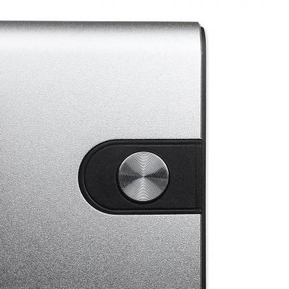 Striking power bank with 10,000 mAh high-performance battery, solid aluminum housing, double USB output, Type-C input and output, as well as charge level indicator. The dominantly designed power button integrated into the black or silver uni-body case makes Flat 10 an elegant promotional gift for discerning brands. Individually with your logo as laser engraving or brilliant printing.