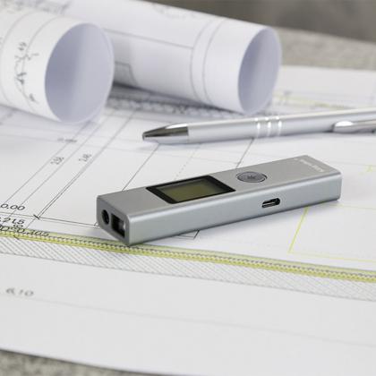 This high-quality mini laser rangefinder is not only incredibly practical, compact and powerful, but also convinces with a first-class design in a solid aluminum uni-body. The extremely slim device, which weighs only 30 grams, fits in any trouser pocket or simply on the key fob. It measures distances or areas up to 40 meters with amazing accuracy and in just 0.2 seconds. A bright LCD display, simple one-button handling and finally the powerful, rechargeable battery make LaseScale an excellent tool when buying, furnishing, planning or building. Available in platinum-coloured aluminium and customised with your logo engraved or printed.