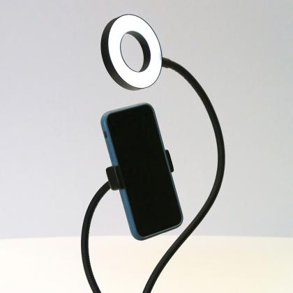 The LED ring light with variable smartphone or webcam holder puts you in the limelight perfectly during online meetings, your live stream or social media presence. 12 cold and warm white LEDs, three different lighting modes and adjustable brightness levels produce a particularly soft light for professional shots or pleasant desk lighting. With the practical table clamp, the ring light can be attached quickly and stably in combination with your device. Flexible gooseneck mounts allow the recording device and light to be brought into any desired position. The variable universal holder fits all smartphones up to a width of 85 mm and is easy to unscrew. Devices such as digital cameras, webcams or similar accessories can be attached to the standard connection thread underneath. Includes USB cable in comfort length (1 meter) and lighting control panel.