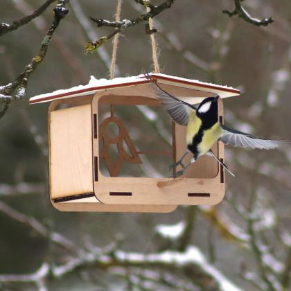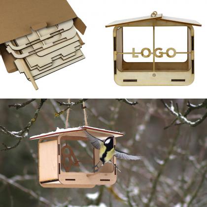 With this kit for a bird feeder, an attractive and necessary food offer for native garden and wild birds is created in a few, simple steps. The responsibility that you as a company take on for domestic species conservation cannot be overlooked. Because your logo - as a laser-cut contour - forms an entire side wall of the house. In a set of eight plug-in parts made of unpainted, certified wood and assembly instructions. For hanging or standing in the garden or on the balcony.