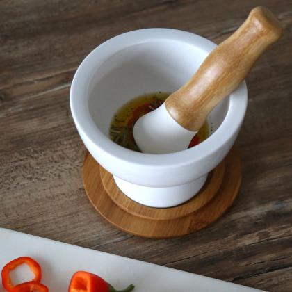 Set consisting of a ceramic mortar with bamboo lid, pestle and a recipe booklet. An ideal kitchen accessory for grinding and crushing herbs, spices, nuts and much more. The combination of white ceramic and bamboo wood is what makes Spicy so aesthetically appealing. Thanks to the recessed notch, you can also use the lid as a coaster for serving freshly prepared seasoning sauces or dips. The mortar is durable and easy to clean – glazed on the outside, rough on the inside. Hygienic by nature, it does not absorb odors or flavors. With your logo as an elegant laser engraving in the wood, Spicy is a tasteful promotional gift in every way that your customers will enjoy. For an extra charge, the recipe booklet cover can be designed by yourself.