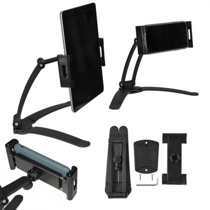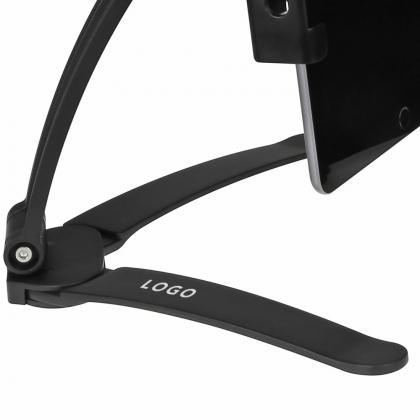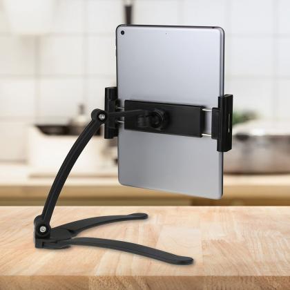 High-quality table stand with additional wall mount for tablets and smartphones. For hands-free use of your devices, for example in the home office, during video conferences, streaming or cooking. Thanks to the extendable mounting bracket, it is suitable for all common devices from 17.8 - 32.8 cm (7" - 12.9") screen diagonal. Ideal for iPad, iPad mini and iPad Pro. 3in1 uses: Either as a comfortable table stand with a sturdy metal base and rubber protection pads, as a solid wall mount or for mounting under wall cabinets. Adjustable height and tilt as well as 360° swivel function can be individually adapted to any situation. Can be folded up to save space. Individually with your logo print, a practical helper for every home office.