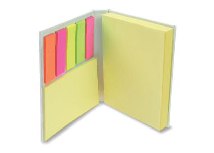 Small notebook with large print area on the front and back. Sticky notes: 100 large adhesive notes of 100x75mm, 25 small adhesive notes of 50x75mm and 25 sheets of page markers in 5 colours.