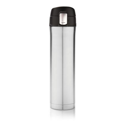 This great double wall stainless steel vacuum flask keeps your drink warm for up to 5 hours or cool for up to 15 hours. The lid is lockable and therefore avoids any risk of leaking or spilling. The lid is easy to keep clean for optimal hygiene and is dishwasher safe. The unique design of the flask allows you to drink conveniently and safely with one hand directly from the flask. The size of the flask is suitable to place in any car drink holder. Made with RCS (Recycled Claim Standard) certified recycled materials. RCS certification ensures a completely certified supply chain of the recycled materials. Total recycled content: 76% based on total item weight. BPA free. Capacity 450ml. Including FSC®-certified kraft packaging.