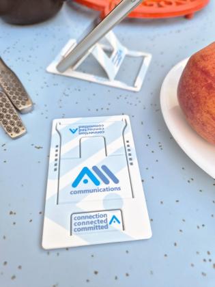 Always made in the UK from recycled plastic or biodegradable Recycled Plus (R+) Plastic which has a speckle appearance. Credit card sized Phone stand. 2.3mm thick phone stand in a credit card style shape. Visible branding areas available on one side. Logo digitally printed CMYK as standard. The ultimate promotional gift idea for tech conferences, office events, trade shows, and corporate giveaways. This innovative product provides hands-free viewing in a sleek, compact design that fits perfectly in your wallet, bag, desk drawer, or workspace for convenient portability. Using a proper phone stand enhances the digital experience whilst showing consideration for the environment by choosing sustainable promotional merchandise. The large branding area makes this phone stand perfect for IT company promotions, corporate hospitality gifts, conference giveaways, and event merchandise. This practical promotional item keeps your brand visible every time customers use their device, creating repeated brand exposure at desks, meeting rooms and home offices whilst providing genuine everyday utility for mobile users of all ages. Also available as a separate 'add on' is the Card Wallet Sleeve which has a wallet effect design on the outside and internal area for additional, CMYK design on the interior to maximise the WalletMate branding. Please note all R+ products are printed without white, including colour versions so they show the natural colour and speckle. Price listed refers to white or R+ Tor only, other colours attract a higher price.