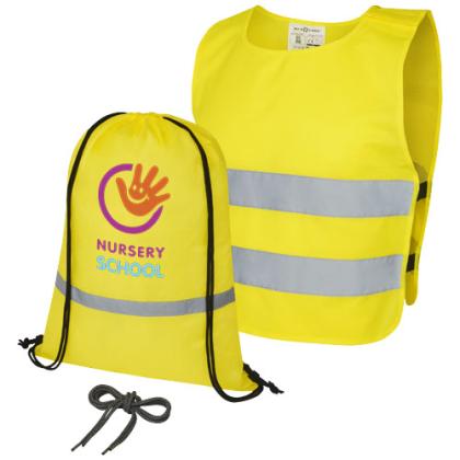 Complete safety and visibility set for children aged 7 to 12 years. This back-to-school giveaway set contains a reflective drawstring backpack, safety vest, and a set of reflective shoelaces. The reflective backpack has a large compartment with drawstring closure and is tested and certified under regulation EN 1150:1999. The high visibility vest in XS size is suitable for children aged 7-12 years with a height between 104-121 cm. Large decoration area on the front and on the back of the vest. On the shoulder and the bottom elastic bands there are hook & loop closures, that offers extra safety and makes the vest easy to put on. The elastic bands on the other side makes it stretchable allowing for easy wearing on thick coats. The vest is tested and certified under regulation EN 1150:1999. It also adheres to the PPE guidelines on application of Regulation (EU) 2016/425 Personal Protective Equipment Category II. The reflective shoelaces are 80 cm long with sturdy ends on both sides for easy placing into any shoe.