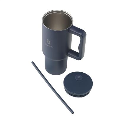 WoW! Large, double-walled drinking cup made from recycled stainless steel with straw. The striking, sturdy mug has a large, plastic handle and a screw-on lid with an opening for the included plastic straw. This huge mug keeps drinks at temperature for longer periods of time. Suitable for cold and hot drinks. Without a straw, the temperature is not lost thanks to the silicone seal in the lid. This mug can go anywhere. Ideal for the gym or the office. Thanks to the conical, narrow bottom, the cup fits in almost any cup holder, making it perfect for on the go. Not dishwasher-safe. RCS-certified. Total recycled material: 75%. Capacity 900 ml. Packed individually.