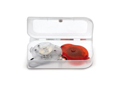 Set of two bike lights in a plastic case. One red light and one white light. A button switches the lights on and off. Constant and flashing function.