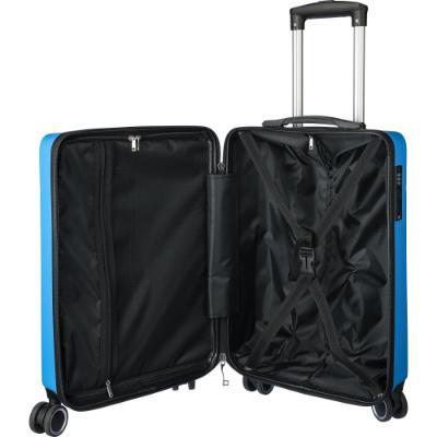 Hard-shell trolley with eight dual spinner wheels, a three-level telescopic handle, combination lock (non-TSA) and three interior compartments. Capacity: 30L. Individually packaged in a brown cardboard box.