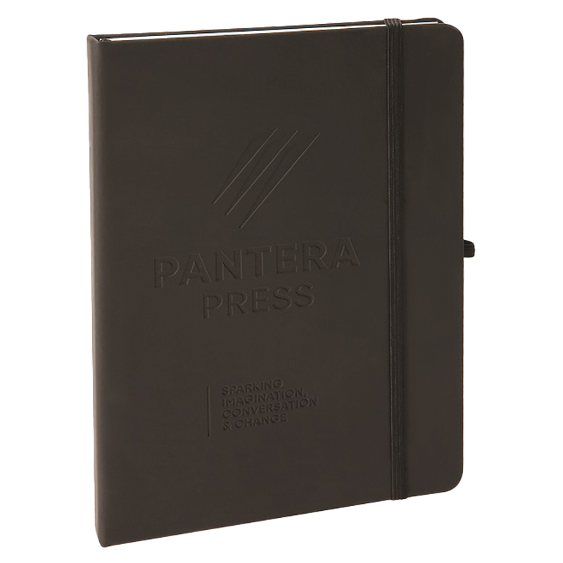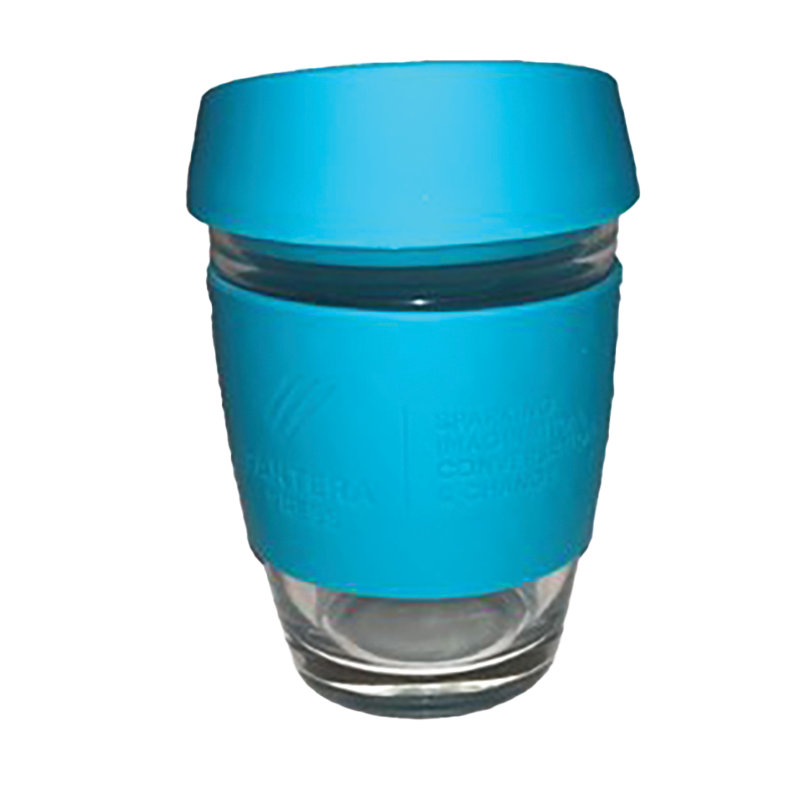 Looking for a discreet finish so as not to emblazon their logo on the tangible items, we searched for suitable items that could achieve this look. A notebook with a blind embossed front cover and dramatic front and back fly sheets was developed alongside Premier Collection. Keeping in mind eco requirements, a glass coffee cup with an embossed silicone sleeve was perfect to showcase the full Pantera Press logo while being discreet.